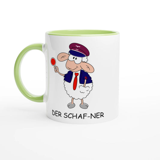 Weiße Keramik-Tasse "DER SCHAF-NER" mit farbiger Innenseite und farbigem Griff