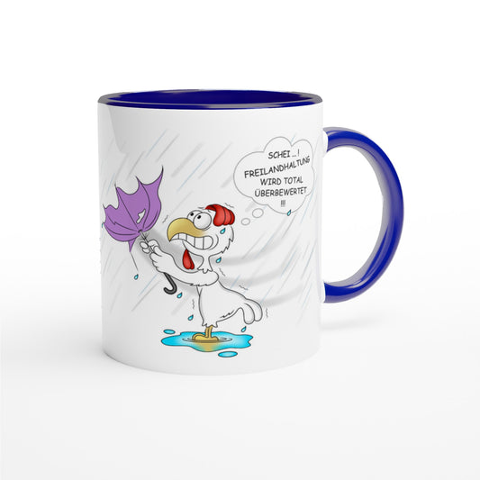 Weiße Keramik-Tasse "Freilandhaltung" mit farbiger Innenseite und farbigem Griff