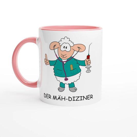 Weiße Keramik-Tasse "DER MÄH-DIZINER" mit farbiger Innenseite und farbigem Griff